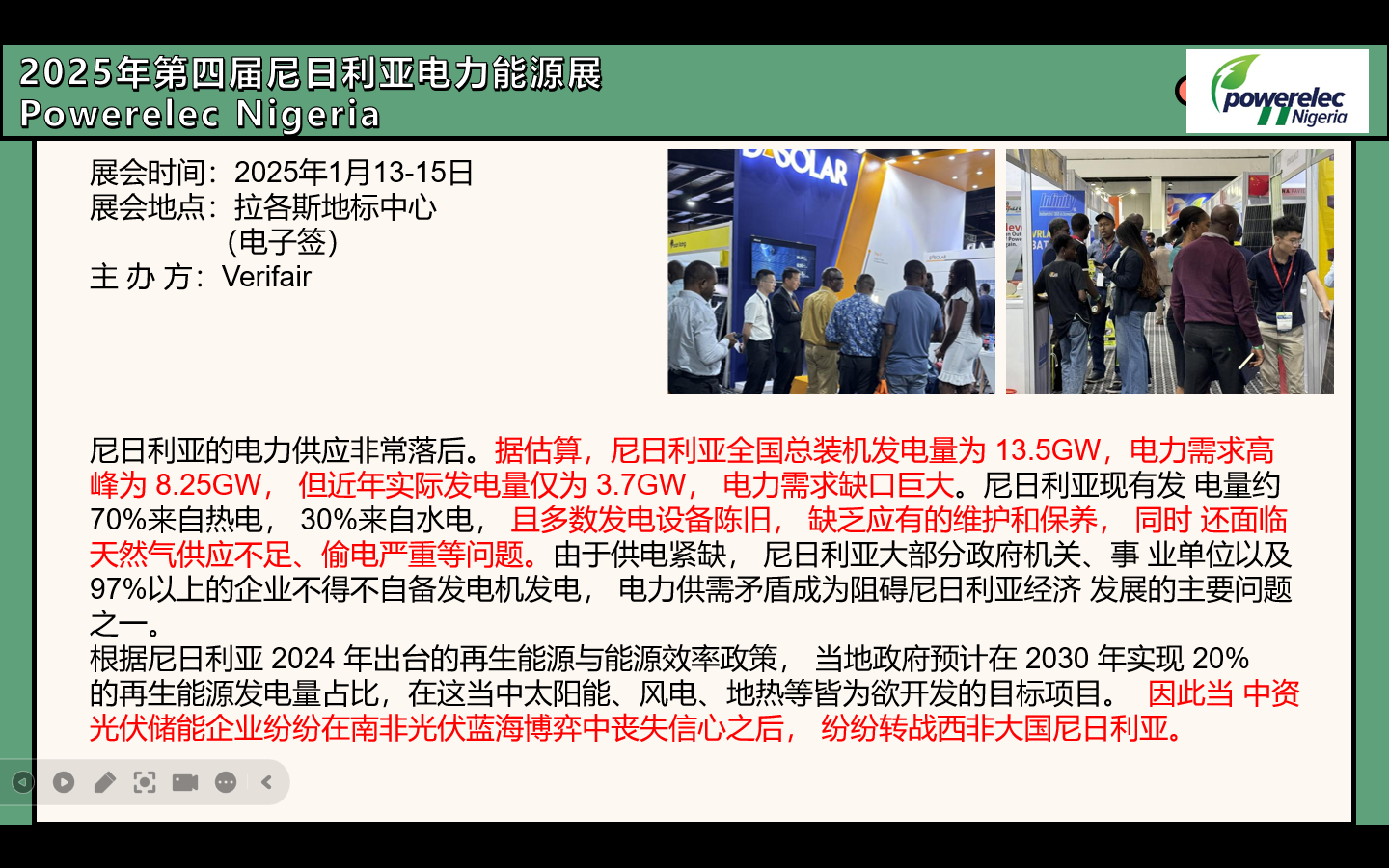 2024年肯尼亚内罗毕电力能源展是将于2024年11月13-15日在内罗毕沙利特博览中心举办。展会的举办地为非洲大陆最大的太阳能市场之---肯尼亚,展会将为东非地区展商提供一个绝佳的展示平台,为业内人士提供一个真正拓展东非地区太阳能市场的机会。该展会是一个可再生能源综合贸易平台,为电力部门的所有利益相关者提供网络和展示产品(发电、电子、电气、服务和技术),交流想法和理解趋势。预计将有来自印度、中国、韩国、土耳其、埃及等地的国家展馆。Powerelec系列在肯尼亚举办展会,将使国内企业能够进入国际组织、供应商、投资者、技术专家和EPC公司,该展会也将是所有国际和国家参与者建立合作伙伴关系和签署商业协议的完美平台。本届肯尼亚电力能源展还欢迎来自可再生能源行业的贸易伙伴和专家,旨在为肯尼亚带来更多的发展机遇。