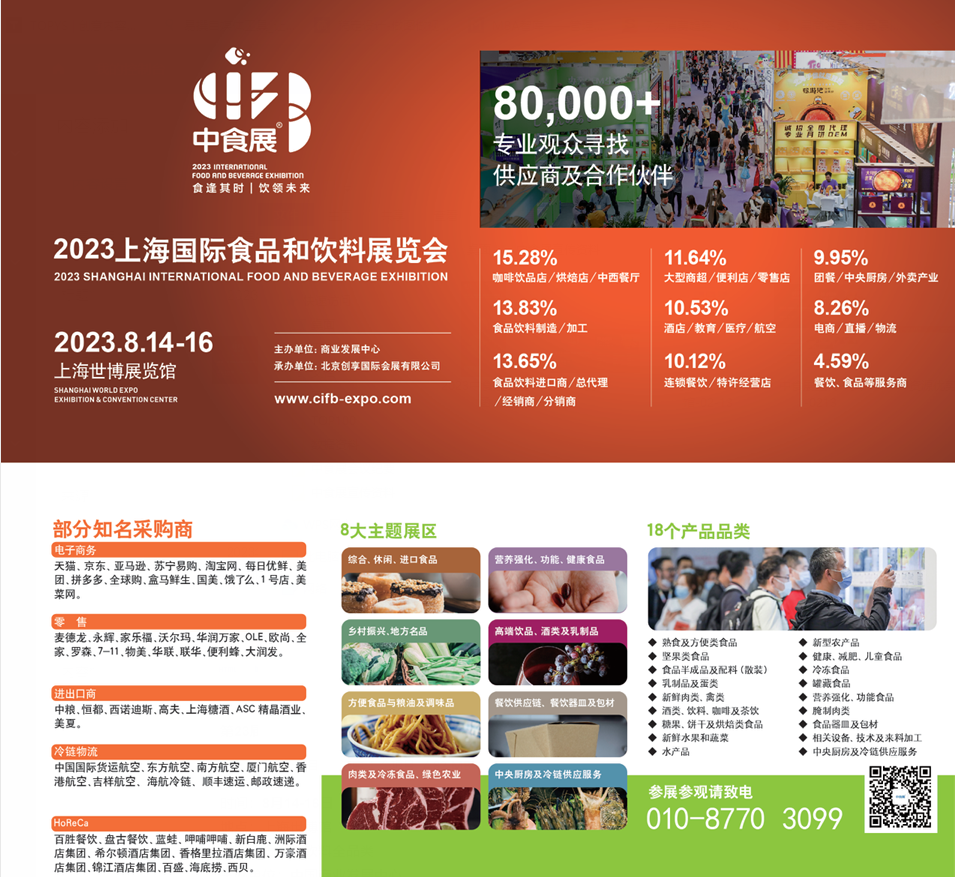 2023年8月14-16日,由中国商业发展中心主办的第23届中食展,将在上海世博馆举办,依托政府资源,着力拉动内需,为食品与饮料产业赋能。 为国内的食品饮料企业,建立全方位的链接。