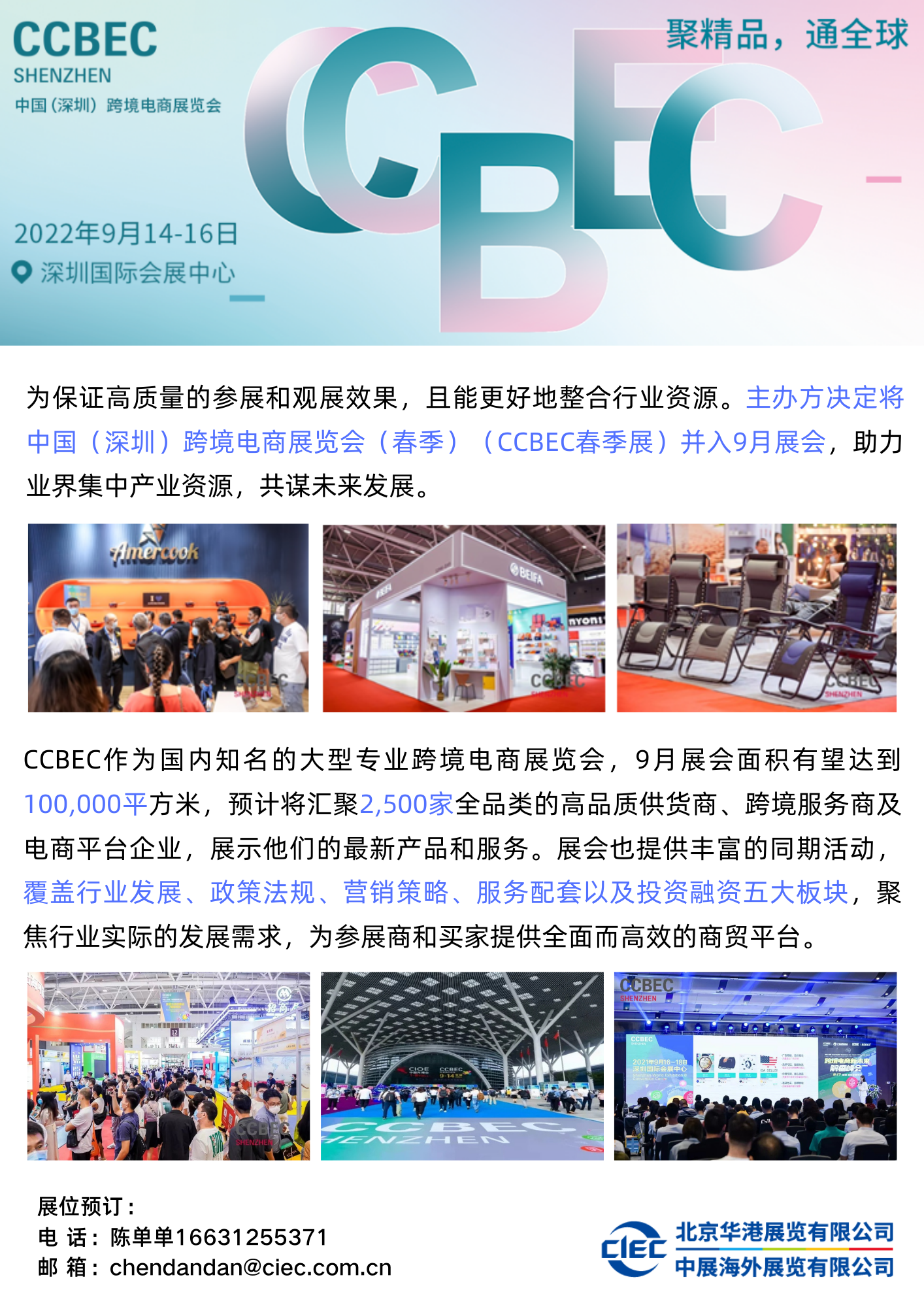 2022 中国(深圳)跨境电商展览会(CCBEC)作为国内知名的大型专业跨境电商展览会,将于9月14-16日在深圳国际会展中心举办。展会面积有望达到100,000平方米,预计将汇聚2,500家全品类的高品质供货商、跨境服务商及电商平台企业,展示他们的最新产品和服务。展会也提供丰富的同期活动,覆盖行业发展、政策法规、营销策略、服务配套以及投资融资五大板块,聚焦行业实际的发展需求,为参展商和买家提供全面而高效的商贸平台。